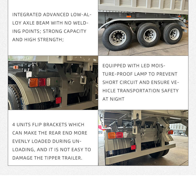 Se tarjoaa joustavia kokoonpanoja erilaisiin tarpeisiin: akselivaihtoehtoja ovat 2/3/4-akselit luotetuilta tuotemerkeiltä BPW ja FUWA sekä mekaaninen tai ilmajousitus vakaaseen ajoon. Varustettu 12R22.5 renkailla, tavallisella 28 tonnin laskutelineellä ja 2"(50mm)/3.5"(90mm) JOST king-tapeilla, se varmistaa vahvan sopeutumiskyvyn. Polyuretaanimaalaus lisää kestävyyttä, väri on muokattavissa ja sillä on kuuden vuoden takuu, mikä tekee siitä luotettavan pitkäaikaisessa hiekan ja soran kuljetuksessa.