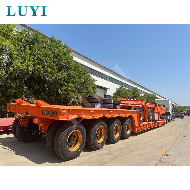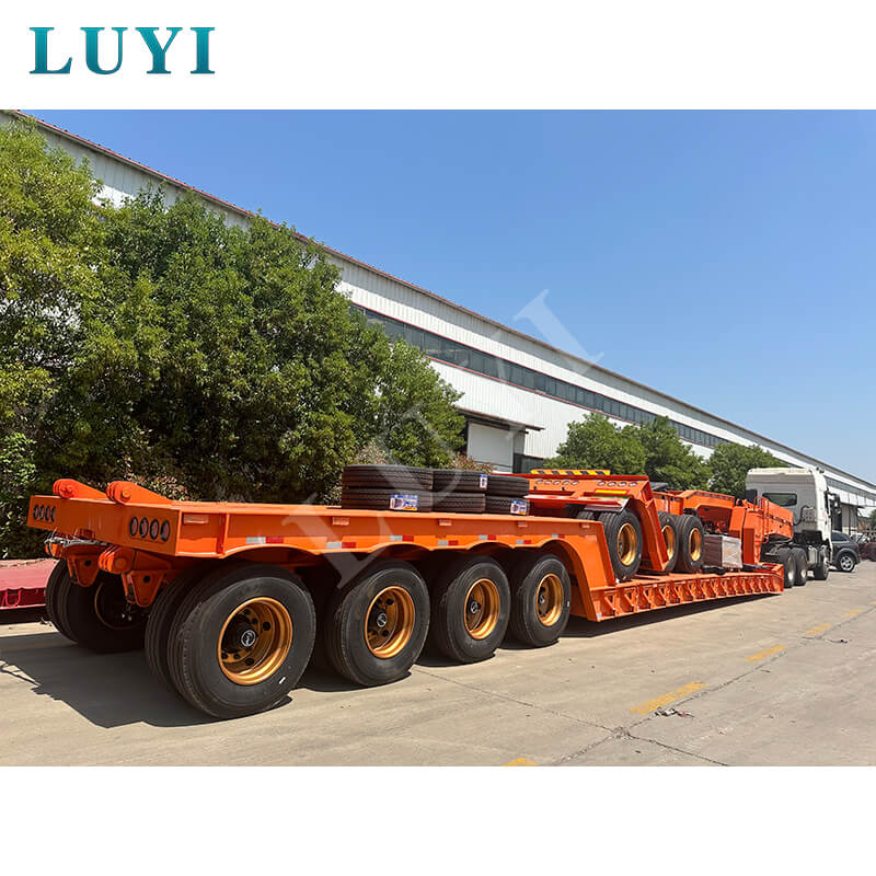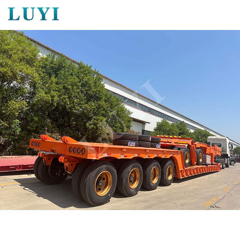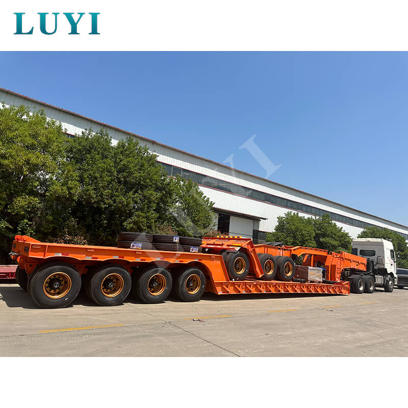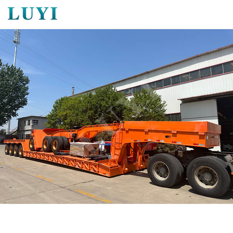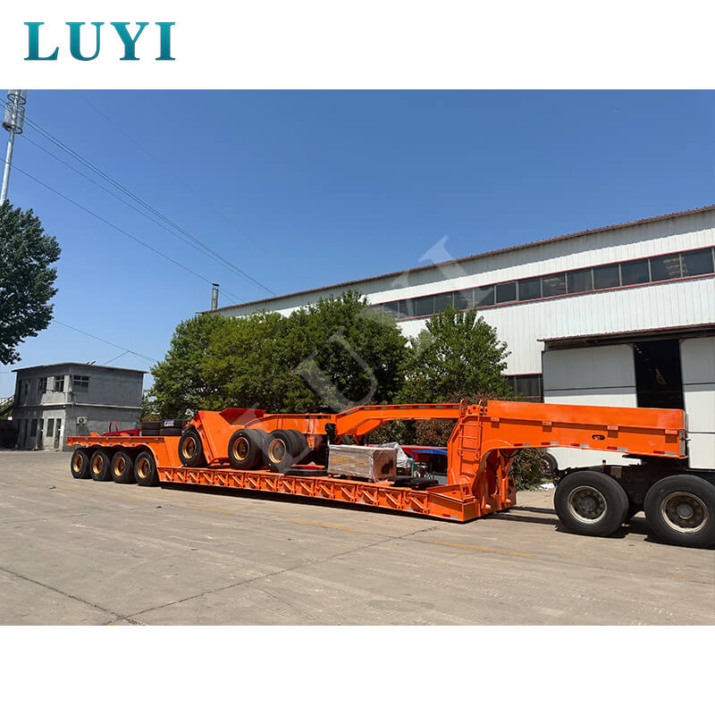 LUYI VEHICLE:n 4-akselinen 100 tonnin Gooseneck Lowboy Semi-Trailer on tehokas kuorma-auton perävaunu, joka on peräisin Shandongin maakunnasta, Kiinasta. Valmistettu korkealaatuisesta teräksestä, sen kaukopalkki käyttää T700/Q345-terästä, mikä varmistaa vankan ja kestävän rakenteen. Kantavuus 100-120 tonnia ja maksimi hyötykuorma 120 000 kg, se täyttää helposti raskaat kuljetustarpeet.