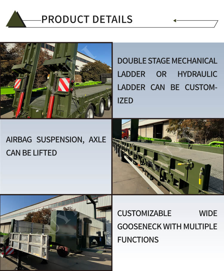 Varustettu neljällä FUWA 13-tonnisella akselilla ja mekaanisella jousituksella, yhdistettynä 12R22.5 renkaisiin, perävaunu varmistaa vakaan toiminnan ja vahvan kantavuuden. Siinä on vakiona 28 tonnin laskuteline ja valinnaiset 90#/50# king-tapit luotettavaa liitäntää varten traktoreihin. Väriä voidaan räätälöidä asiakkaan tarpeiden mukaan yhdistäen käytännöllisyys ja personointi. Olipa kyseessä suurten koneiden tai raskaan kaluston kuljettaminen, tämä perävaunu on luotettava valinta erinomaisen suorituskyvyn ja vankan laadun ansiosta.