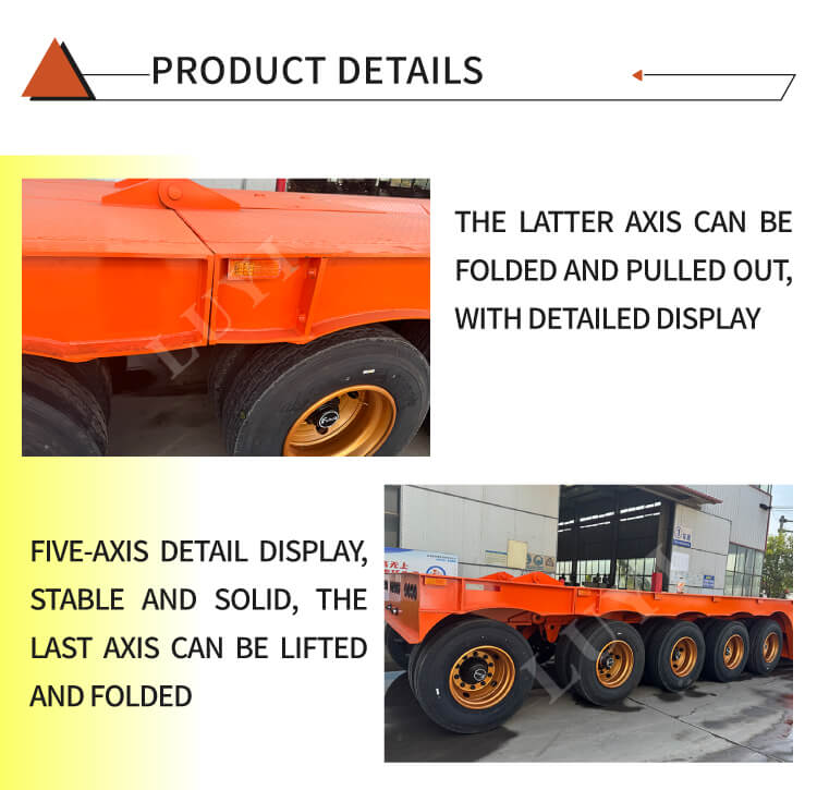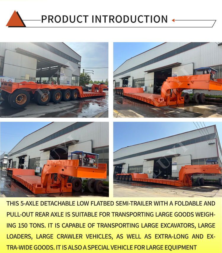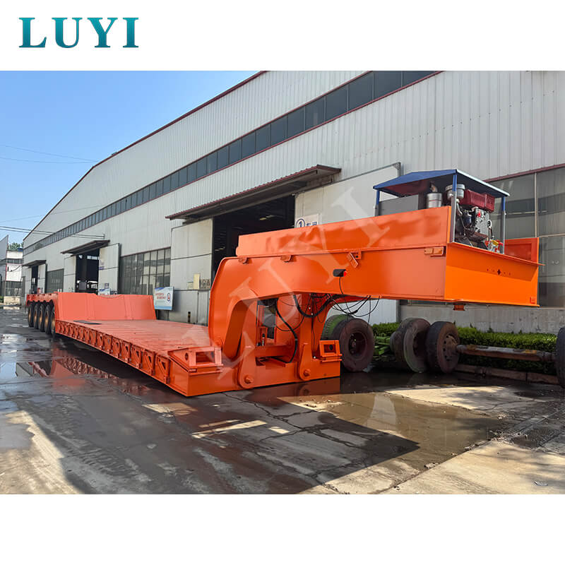 LUYI 5-akselinen irrotettava hanhenkaula-alusperävaunu, joka on valmistettu Shandongissa, Kiinassa, on erittäin suorituskykyinen raskas kuljetusajoneuvo, joka on räätälöity erittäin raskaisiin rahtitarpeisiin.