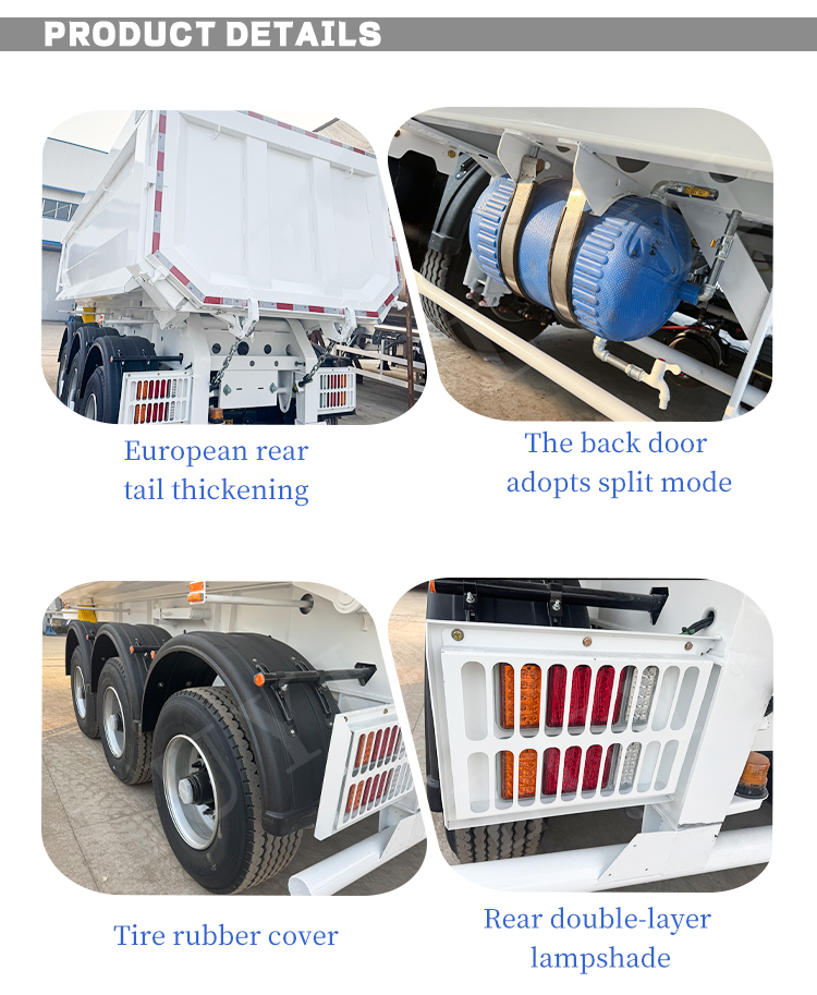 LUYI:n kolmiakselinen U-muotoinen hydraulisesti säädettävä takakippipuoliperävaunu on tehokas kuljetusväline, joka on erityisesti suunniteltu materiaalien kuten hiekan, soran ja viljan kuljetukseen. Se on peräisin korkealaatuisesta valmistuksesta Shandongissa, Kiinassa.