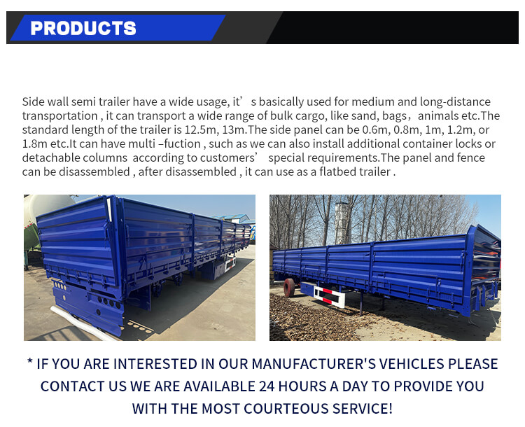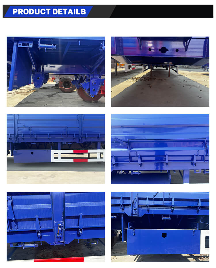 Perävaunun mitat ovat 12500×2500×1600 mm, ja se on varustettu 3 akselilla (kukin 13 tonnia) ja mekaanisella jousitusjärjestelmällä tasaisen ajon ja luotettavan kantavuuden varmistamiseksi. Siinä on vakiona 28 tonnin laskuteline turvallista lastaamista ja purkamista varten ja renkaat 12R22.5/12.00R20/11R22.5 eritelmien mukaisiksi erilaisiin tieolosuhteisiin. Lisäksi 90×13×10 mm lehtijouset lisäävät kantokykyä, mekaaniset tikkaat lisäävät käyttömukavuutta ja värit voidaan räätälöidä tarpeen mukaan, mikä tarjoaa joustavan ja luotettavan räätälöidyn ratkaisun logistiikkaan ja kuljetuksiin.