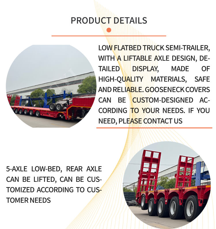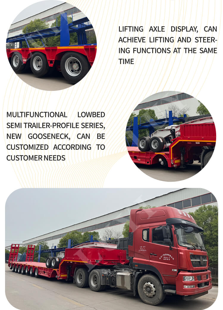LUYI 8-Axle 120T Air Suspension Low-Bed Semi-Trailer, joka on peräisin Shandongista, Kiinasta, on korkean suorituskyvyn puoliperävaunu, joka on suunniteltu erityisesti raskaan kaluston kuljetukseen. Valmistettu korkealaatuisesta teräksestä, sen mitat ovat 22 000 × 3 000 × 1 600 mm ja maksimi hyötykuorma 100 tonnia, mikä vastaa helposti erilaisten raskaan kaluston kuljetustarpeisiin.
