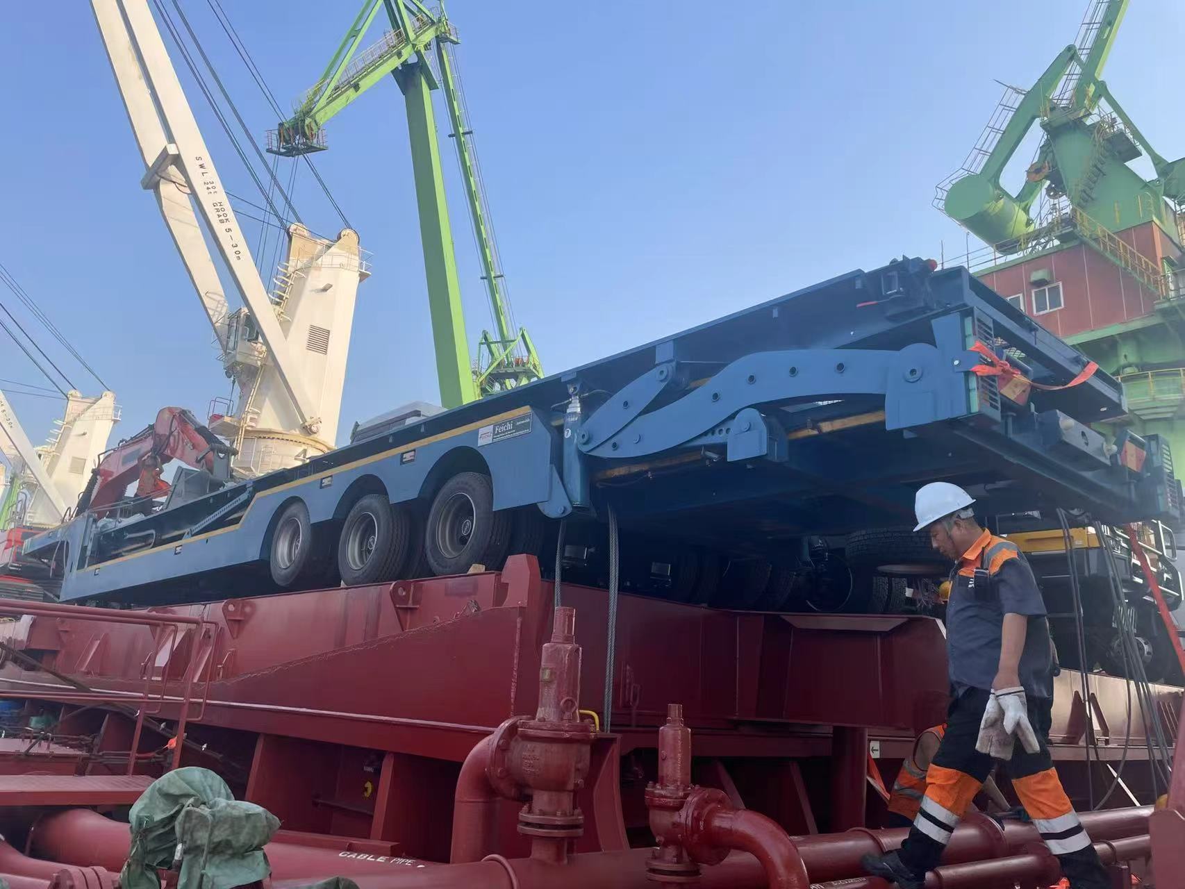 Alkusyksystä kansainvälisessä satamassa Shandongin maakunnassa oli vilkasta toimintaa. Kymmenet Luyit3-akseliset 4-jalkaiset lava-puoliperävaunutpysäköity asianmukaisesti terminaaliin. Useiden toimenpiteiden, kuten tullitarkastuksen ja turvallisuuden vahvistamisen, jälkeen lavapuoliperävaunut nostettiin hitaasti valtamerirahtialuksen lastitilaan ammattimaisilla nostovälineillä. Tämä lastausoperaatio käynnisti virallisesti rajat ylittävän kuljetusyhteistyön Luyi-brändin ja kazakstanilaisten asiakkaiden välillä. Luyi 3-akseliset 4-jalkaiset lavapuoliperävaunut ylittävät kansalliset rajat tarjotakseen raskaan kuorman ratkaisuja kuljetusalalle Kazakstanissa.